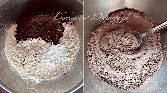 - Przygotować ciasto ucierane: W misce wymieszać mąkę z kakao i proszkiem do pieczenia. Przesiać i odstawić na bok.