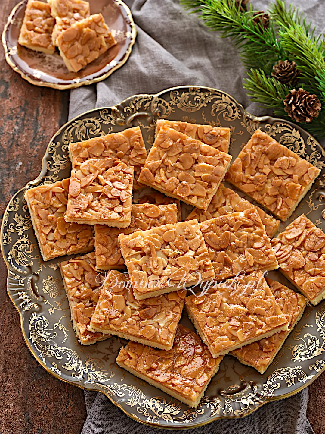 * Idealna polewa powinna mieć kolor złocisto-karmelowy - lekko ciemniejszy, bursztynowy przy brzegach, z błyszczącymi migdałami. Zbyt jasna polewa oznacza niedostateczną karmelizację - będzie miękka i mniej aromatyczna. Z kolei zbyt ciemna, bliska przypaleniu, stanie się gorzka w smaku.