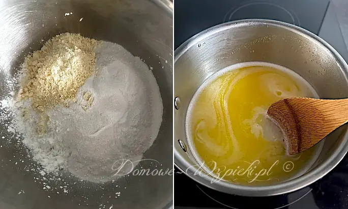 - Przygotować ciasto parzone: Do miski wsypać mąkę ryżową, kukurydzianą i skrobię. Wymieszać i odstawić na bok.